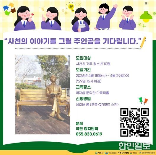 한민일보 서울포커스 김은금 기자 | 사천시, 사천문인협회, 극단 장자번덕은 4월 29일까지 지역 청소년을 대상으로 문화예술교육 '내 마음의 삼천포, 박재삼을 그리다'의 참가자를 모집한다고 19일 밝혔다.