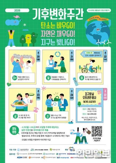 또한 ‘기후 동행 탄소중립 생활 실천 챌린지’는 20일부터 24일까지 카카오톡 채널을 이용한 온라인 실천 인증 캠페인으로 운영한다. 요일별로 다른 실천 주체를 정해 참여자들이 인증 숏을 공유하고, 추첨으로 모바일 쿠폰을 제공한다. 실천 주제는 ▲잔반 제로(Zero) ▲다회용품 사용 ▲친환경 이동 ▲소등 행사 참여 ▲채식 ▲물품 기부 등이다.