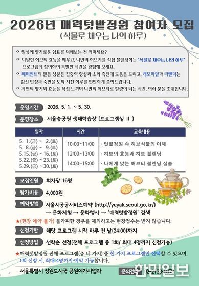 ‘매력텃밭정원’ 프로그램의 자세한 일정과 내용은 서울특별시 공공서비스예약을 통해 확인할 수 있으며, 각 프로그램 시작 2주 전 월요일부터 선착순 신청할 수 있다.
