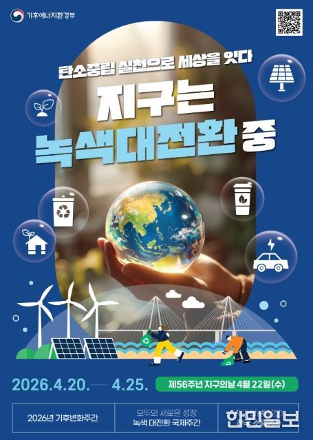 한민일보 서울포커스 진광성 기자 | 기후에너지환경부는 지구의 날(4월 22일)을 맞아 4월 20일부터 24일까지 ‘2026년 기후변화주간’을 개최한다. 올해 기후변화주간은 ‘녹색대전환 국제주간(4.20~4.25)’과 연계되어 국제사회의 탄소중립 기술과 정책, 국민의 일상 속 기후행동 실천이 함께 어우러지는 탄소중립 실천문화 확산을 위한 참여와 공감의 장이 마련될 전망이다.