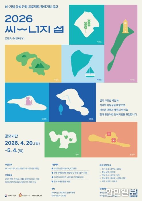 한민일보 서울포커스 김서윤 기자 | 문화체육관광부가 주최하고 한국관광공사가 주관한 2026년 씨너지『섬-기업 상생 관광프로젝트』 참여기업 공모를 오는 4월 20일 월요일 부터 5월 4일 월요일까지 모집한다.