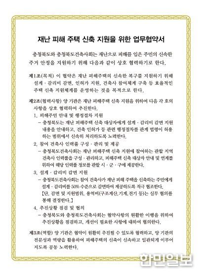 협약에 따라 도는 신속한 인·허가 등 관련 행정절차 처리를 협조하고, 충북건축사회는 설계·감리비의 최대 50% 수준 감면 및 전문 지원체계 구축 등 피해 도민은 즉각적인 기술 자문과 설계를 지원받을 수 있는 체계를 운영한다.