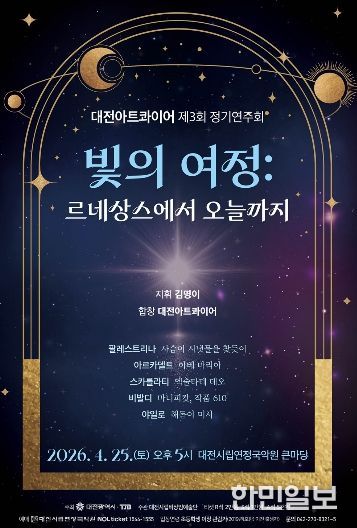 한민일보 서울포커스 김서윤 기자 | 대전아트콰이어는 4월 25일 오후 5시, 대전시립연정국악원 큰마당에서 제3회 정기연주회‘빛의 여정: 르네상스에서 현대까지’를 개최한다.
