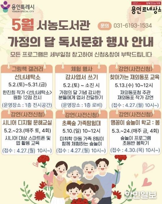 한민일보 서울포커스 김성윤 기자 | 용인특례시 서농도서관은 오는 5월 가정의 달을 맞아 다양한 세대를 아우르는 프로그램으로 이뤄진 ‘2026년 5월 독서문화행사’를 마련했다고 21일 밝혔다.