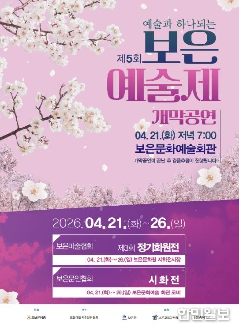 이경숙 문화관광과장은 “이번 보은예술제가 군민들이 일상 속에서 문화와 예술을 가까이에서 즐기고 공감할 수 있는 시간이 되길 바란다”며 “다양한 전시와 공연이 어우러진 이번 행사가 지역에 따뜻한 활력을 더하길 기대한다”고 말했다.