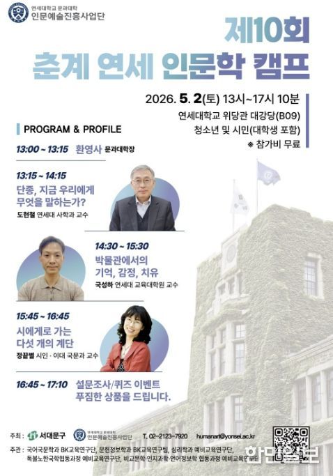 한민일보 서울포커스 김서윤 기자 | 서대문구가 연세대학교 문과대학과 공동으로 5월 2일 오후 1시부터 5시 10분까지 연세대 위당관 대강당(B09호)에서 ‘제10회 연세 인문학 캠프’를 개최한다.