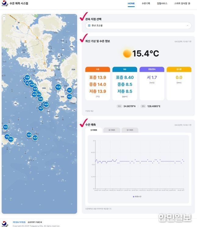 한민일보 서울포커스 김서윤 기자 | 통영시는 해양 기후변화에 따른 연안 재해 대응 강화를 위해 개발한 고수온 예측 서비스의 신청 접수를 지난 20일부터 시작했으며, 오는 5월부터 본격 운영에 들어간다.