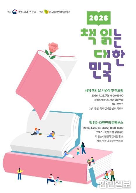 한민일보 서울포커스 박용남 기자 | 문화체육관광부는 한국출판문화산업진흥원, (재)책읽는사회문화재단과 함께 4월 23일 오후 4시, 서울 코엑스 별마당도서관에서 대국민 독서 캠페인 ‘2026 책 읽는 대한민국’의 시작을 선포하고 캠페인을 본격적으로 추진한다. ‘책 읽는 대한민국’은 인공지능(AI) 시대에 국민의 생각하는 힘을 기르고, 지역 곳곳에 ‘일상 속 책 읽는 즐거움’을 확산하기 위해 마련한 캠페인이다. 최휘영 장관은 캠페인 선포식을 찾아 ‘책 읽는 즐거움’ 확산에 앞장선다.