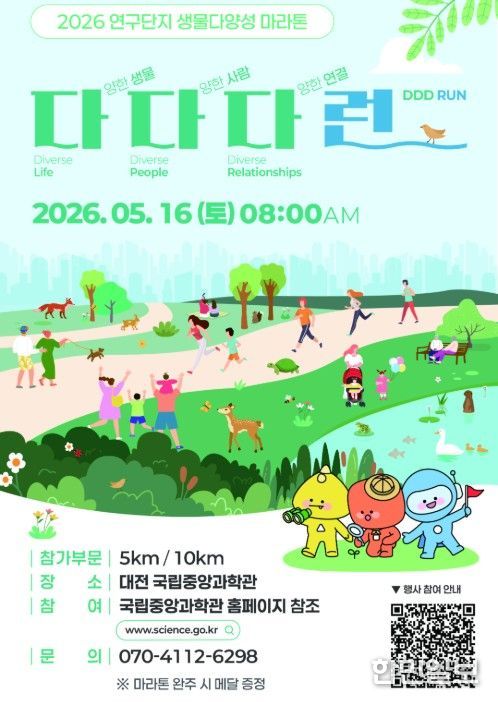 한민일보 서울포커스 기자 | 과학기술정보통신부 국립중앙과학관은 생물다양성의 소중함을 온몸으로 체감하고 일상 속 친환경 실천 문화를 확산하기 위한 2026 연구단지 생물다양성 마라톤 ‘다다다런(다양한 생물, 다양한 사람, 다양한 연결)’을 개최한다고 밝혔다.