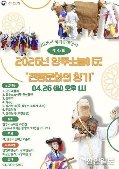 한민일보 서울포커스 차재만 기자 | 양주시는 국가유산청의 지원을 받아 ‘제43회 양주소놀이굿 정기공개행사’를 오는 26일 오후 1시, 양주소놀이굿 전수교육관 공연장에서 개최한다고 밝혔다.