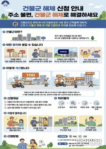 건물군은 여러 개의 건축물을 하나로 묶어 동일한 건물번호를 부여·관리하는 방식이다. 그러나 건물군 내 여러 거주자와 이용자가 있음에도 하나의 건물번호만 사용함에 따라 우편물과 택배, 소포 등이 대표 건물로 집중되는 사례가 발생하고 있다. 이로 인해 등기 반송, 택배 오배송, 방문객 안내 지연 등 생활 속 불편이 지속돼 왔다. 또한 실제로는 서로 다른 건축물임에도 주소상 동일한 건물번호를 사용함으로써 위치 식별이 어렵고, 응급상황이나 안전사고 발생 시 신속한 대응에도 어려움이 있었다.