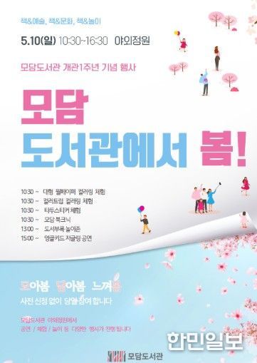 한민일보 서울포커스 임경복 기자 | 김포 최대 규모 공공도서관인 모담도서관이 개관 1주년을 맞아 오는 5월 10일 ‘책과 문화·예술·놀이’가 어우러지는 행사를 연다. 이번 행사는 시민들에게 감사의 마음을 전하고 복합문화공간으로서의 역할을 수행하고자 마련된 것으로, 사전예약 없이 도서관 방문자 누구나 참여 가능하다.