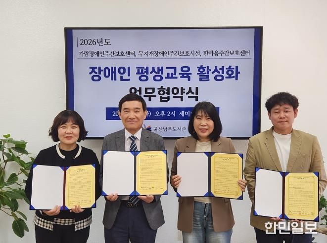 한민일보 서울포커스 임경복 기자 | 울산 남부도서관은 21일 도서관 세미나실에서 가람장애인주간보호센터, 무지개장애인주간보호시설, 한마음주간보호센터와 장애인 평생학습 활성화 업무협약을 체결했다.