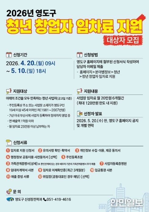 한민일보 서울포커스 임광현 기자 | 부산 영도구는 청년 창업가들의 경제적 부담을 덜어주고 지역 내 안정적인 사업 기반 마련을 돕기 위해 지난해에 이어 '2026년 청년 창업자 임차료 지원사업' 참여자를 모집한다고 밝혔다.