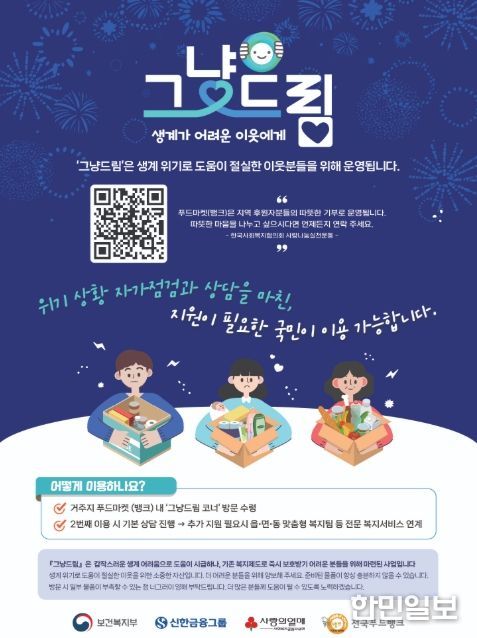 그냥드림 사업은 긴급 생계 위기 등으로 어려움을 겪는 국민이 별도의 복잡한 증빙 절차 없이도 식품과 생필품을 신속하게 지원받을 수 있도록 복지 문턱을 낮춘 사회 안전망이다. 물품 지원 이후에는 상담과 복지서비스 연계를 병행하여 복지 사각지대를 해소하고 안정적인 생활기반 마련을 지원하고 있다.