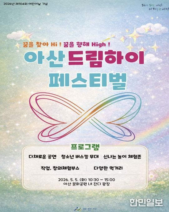 한편, 올해 '아산 드림하이 페스티벌'은 오는 5월 5일 어린이날 오전 10시 30분부터 오후 3시까지 아산문화공원 잔디광장 일원에서 열린다. 신정호수공원에서 이어져 온 어린이날 기념행사가 올해 처음으로 도심으로 개최 장소를 옮기게 됐으며, 아산시청 인근의 접근성 좋은 공간에서 진행되는 만큼 더욱 많은 시민이 편리하게 참여할 수 있을 것으로 기대된다.