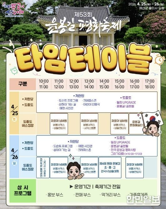 한민일보 서울포커스 임경복 기자 | 예산군은 ‘제53회 윤봉길 평화축제’를 오는 4월 25일부터 26일까지 덕산면 충의사 일원에서 개최한다고 밝혔다.