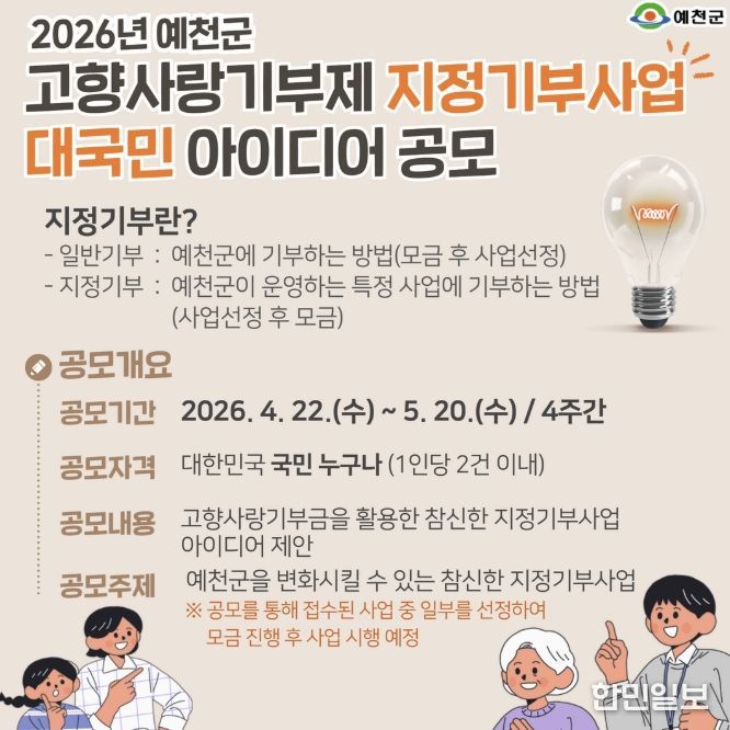 한민일보 서울포커스 임경복 기자 | 예천군은 기부자가 사업 목적에 공감하고 직접 수혜 대상을 결정하는 ‘고향사랑 지정기부제’를 적극 도입하기로 하고, 그 첫걸음으로 4월 22일부터 5월 20일까지 '2026년 예천군 고향사랑기부제 지정기부사업 아이디어 공모전'을 열어 국민들의 참신한 제안을 받는다.
