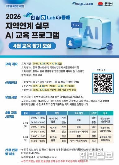 한민일보 서울포커스 임경복 기자 | 동해시와 한림대학교(총장 최양희)는 동해시 청소년센터와 북평산업단지 복합문화센터에서 공공행정 및 지역 산업체 종사자를 대상으로 직무 특성에 맞춘'한림 G-Lab@동해 지역 연계 실무형 AI 교육 프로그램'을 운영한다고 밝혔다.