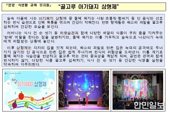 참고로 교육부는 현장소통단의 의견을 수렴하여, 2024년부터 유아의 눈높이에 맞춘 교육용 뮤지컬을 개발해 찾아가는 공연 사업을 추진하고 있다. 올해도 식문화 이해와 긍정적인 식습관 형성을 주제로 하는 새로운 뮤지컬을 개발하여 현장 교육을 지원할 계획이다.