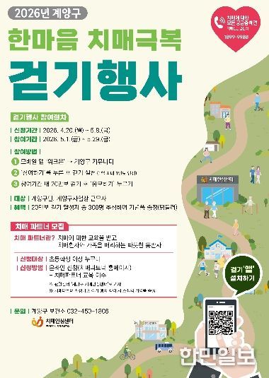 한민일보 서울포커스 김성혜 기자 | 인천광역시 계양구는 구민의 치매 예방과 인식 개선을 위해 5월 1일부터 29일까지 4주간 ‘2026년 계양구 한마음 치매극복 걷기행사’를 개최한다.