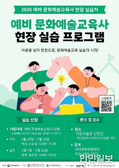 신청은 4월 28일까지 가능하며, 문화예술교육사 2급 자격과정 이수자 또는 ‘문화예술교육 현장의 이해와 실습’ 교과목 수강자를 대상으로 한다. 접수는 포스터 내 QR코드를 통해 네이버폼으로 진행된다.