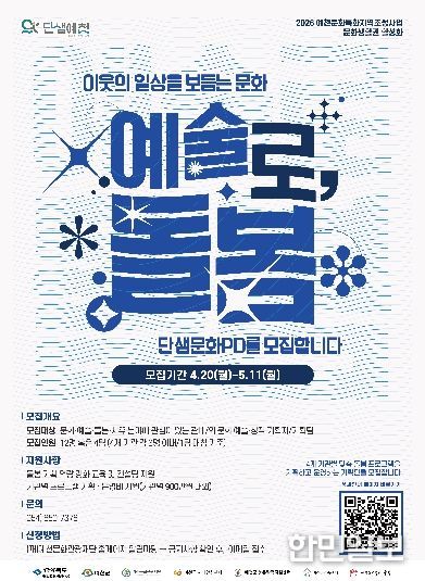 ‘단샘문화PD’는 지역 문화 프로그램을 직접 기획·운영하는 전문 인력으로, 이번 공모를 통해 '예술로, 돌봄' 사업의 핵심 기획자로 활동하게 된다.
