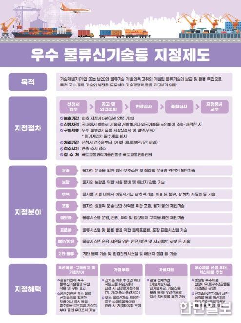 물류신기술 제도는 국내 최초로 개발되거나 외국에서 도입하여 개량한 물류기술을 평가해 △신규성 △진보성 △경제성 △현장적용성 △보급‧활용성이 우수한 기술을 국토교통부 장관이 지정하는 제도다. 물류기술의 보급 및 활용 촉진을 위해 2020년부터 시행됐으며 지금까지 총 9건이 지정됐다.