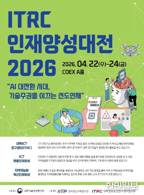 한민일보 서울포커스 기자 | 과학기술정보통신부는 4월 22일부터 4월 24일까지 3일간 국가 AI·ICT R&D 우수성과물 홍보 및사업화 기회를 제공하기 위한 '2026 정보통신(‘ICT’) 기술사업화 페스티벌'과 대학의 석박사급 인재양성 연구·교육 성과 교류·확산을 위한 '2026 ITRC 인재양성대전'을 서울 삼성동 코엑스에서 개최한다.