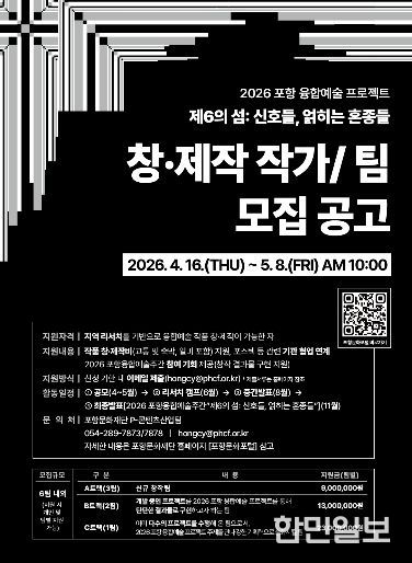 한민일보 서울포커스 임경복 기자 | (재)포항문화재단은 ‘포항 융합예술 플랫폼’(포항의 융합예술 인프라)을 기반으로, 융합예술 분야에서 창의적 성과를 만들어갈 창·제작 팀을 공개 모집한다.