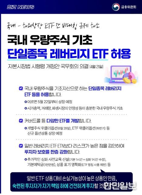 · 국내 우량주식을 기초자산으로 하는 단일종목 레버리지 ETF 등을 허용합니다.