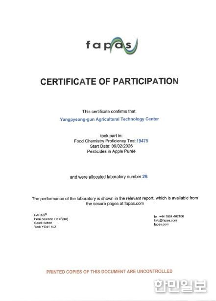 한민일보 서울포커스 차재만 기자 | 양평군은 영국 식품환경연구청(FERA)이 주관한 ‘2026년 잔류농약 국제비교숙련도 평가’에서 최고 수준의 분석능력을 인정받아 3년 연속 우수성을 입증했다고 21일 밝혔다.