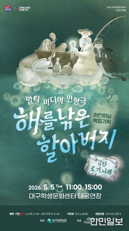한민일보 서울포커스 임경복 기자 | 대구학생문화센터는 어린이날을 맞아 어린이와 가족 관객을 위한 특별 기획공연 '멀티미디어 인형극 해를 낚은 할아버지'를 오는 5월 5일 대공연장에서 선보인다.