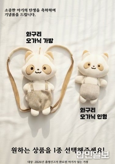 이번에 추가된 축하 기념품은 ‘와구리 백팩’으로, 기존에 지급하던 ‘와구리 애착인형’과 새롭게 추가된 ‘와구리 백팩’ 가운데 하나를 선택해 받을 수 있다. 유기농 애착 인형은 아이의 정서적 안정과 수면 습관 형성에 도움을 주어 정서적 교감을 중시하는 가정에 적합하며, 와구리 백팩은 기저귀와 손수건 등 간단한 유아용품을 수납할 수 있도록 제작돼 실용성을 중시하는 가정에 도움이 될 것으로 기대된다.