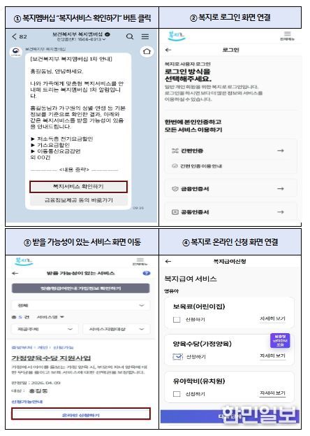 앞으로는 안내 문자 하단의 “복지서비스 확인하기” 버튼을 클릭하면 안내받은 복지서비스를 곧바로 온라인으로 신청*할 수 있어 안내부터 신청까지 한 번에 처리할 수 있게 됐다.