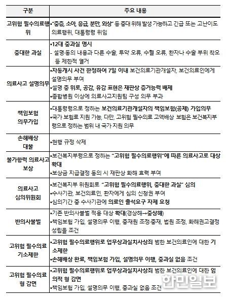 불가항력 의료사고 보상 대상을 기존 분만사고에서 ‘보건복지부령으로 정하는 고위험 필수의료행위’로 확대하여 필수의료에 대한 국가책임을 강화했다. 보상 대상인 고위험 필수의료행위의 범위·유형에 대해서는 의료계, 전문가 등과 논의하여 보건복지부령을 통해 구체화할 예정이다.