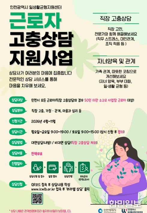한민일보 서울포커스 유창렬 기자 | (재)인천여성가족재단 인천 일생활균형지원센터는 근로자의 직장 내 고충 해소와 건강한 일생활 균형 실현을 위해 '근로자 고충상담 지원사업' 상담 신청 접수를 4월부터 시작했다고 밝혔다.