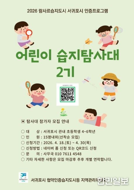 한민일보 서울포커스 김다남 기자 | 서귀포시협약인증습지도시등 지역관리위원회는 30일까지 서귀포시의 습지 가치를 알릴 ‘제2기 어린이 습지탐사대’ 대원을 모집한다.