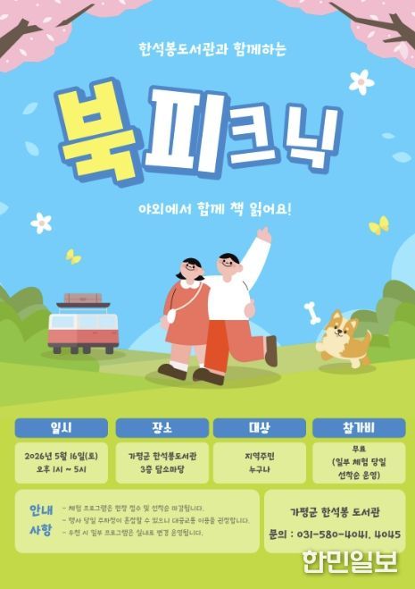 한민일보 서울포커스 최성훈 기자 | 가평군은 5월 가정의 달을 맞아 오는 16일 한석봉도서관 3층 담소마당에서 ‘가족과 함께하는 북 피크닉’ 행사를 개최한다고 밝혔다.