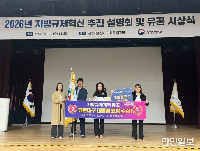 한민일보 서울포커스 임광현 기자 | 해운대구는 행정안전부 주관‘2025년 지방규제혁신 추진 성과평가’에서 우수한 성과를 인정받아 지난 22일 지방규제개혁 유공 대통령 표창을 수상하였다.
