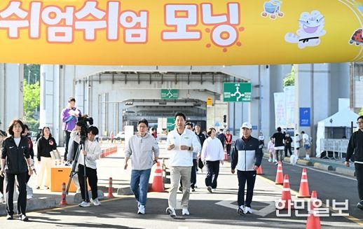 이날 ‘쉬엄쉬엄 모닝’은 반포한강공원 달빛광장을 출발해 잠수교 남단을 지나 출발점으로 되돌아오는 2km 순환코스다. 오 시장은 쉬엄쉬엄 모닝과 도착지점에 마련된 ‘찾아가는 서울체력장’에서 높이 뛰기 등 프로그램에 참여했다.