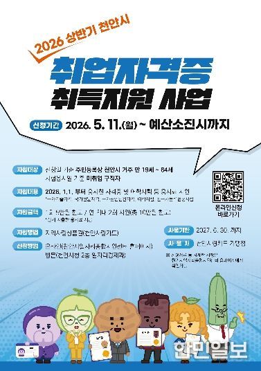 한민일보 서울포커스 황준형 기자 | 천안시가 구직자의 경제적 부담을 완화하고 취업 역량 강화를 돕기 위해 ‘2026년 상반기 취업자격증 취득지원 사업’ 참가자를 모집한다고 27일 밝혔다.