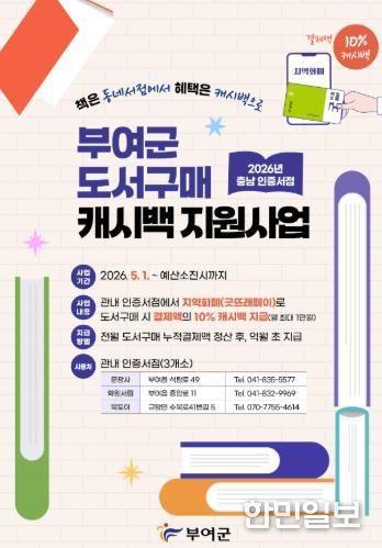 한민일보 서울포커스 유돈상 기자 | 부여군이 지역서점 활성화와 독서문화 확산을 위해 ‘충남 인증서점 도서구매 캐시백 지원사업’을 실시한다고 27일 밝혔다.