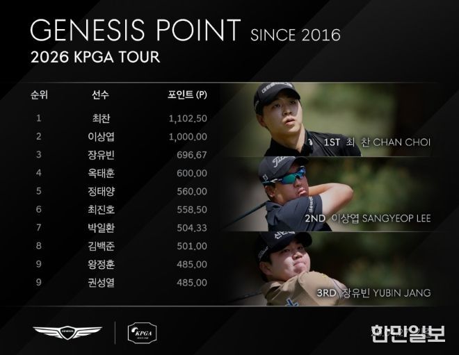 최찬은 ‘2026 우리금융챔피언십’에서 최종합계 13언더파 271타로 우승해 제네시스 포인트 1,000 포인트를 추가한 1,102.50 포인트로 단숨에 제네시스 포인트 1위에 올라섰다. 최찬이 제네시스 포인트 1위에 위치한 것은 2022년 투어 입성 이후 최초다.
