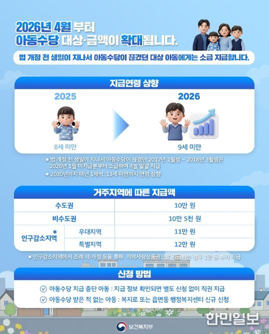 한민일보 서울포커스 임경복 기자 | 2026년 4월부터 아동수당 대상·금액이 확대됩니다.