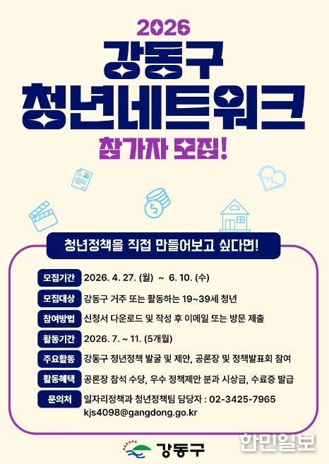 한민일보 서울포커스 박정민 기자 | 서울 강동구는 ‘2026년 강동구 청년네트워크’ 참여자를 모집한다고 밝혔다. 청년네트워크는 청년들이 직접 의제를 발굴하고 정책을 제안하는 사업이다.