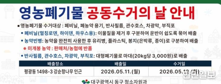 한민일보 서울포커스 임경복 기자 | 대구 동구청은 5월 27일까지 농촌지역에 영농폐기물 공동수거의 날을 지정해 운영한다.
