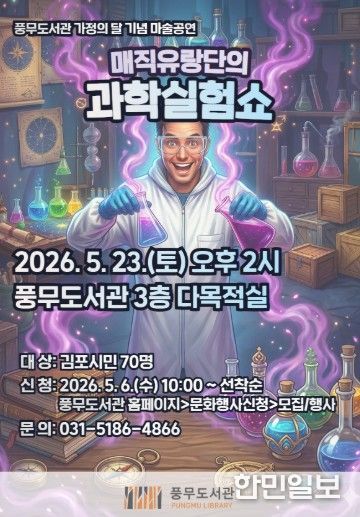 한민일보 서울포커스 임경복 기자 | 김포시 풍무도서관에서는 5월 23일 오후 2시부터 3시까지 마술공연 ‘매직유랑단의 과학실험쇼’를 운영한다. 가정의 달을 맞아 도서관 이용 가족에게 특별한 문화 향유 기회를 제공하고자 기획된 공연이다.