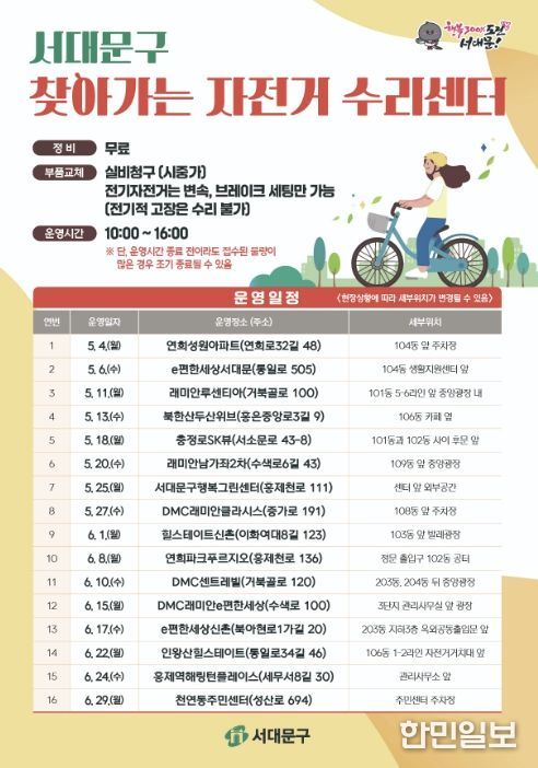 한민일보 서울포커스 김서윤 기자 | 서대문구가 주민들의 자전거 이용 활성화와 안전한 운행을 위해 5∼6월과 9∼11월 ‘찾아가는 자전거 수리센터’를 총 32회 운영한다.