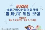 한민일보 서울포커스 김서윤 기자 | 남해군은 2026년 지역 청소년 정책을 함께 만들어 갈 청소년참여위원회 신규 위원을 모집한다고 밝혔다. 청소년참여위원회 ‘청바지’(청소년을 위한 청소년이 바라는 청소년들에 의한 지역사회)는 청소년 관련 정책과 사업을 제안하고, 사업 추진 과정에 주체적으로 참여하는 청소년 참여 기구다. 청소년의 권익 증진과 실질적인 정책 반영을 위해 운영 되며, 학교 생활, 진로, 문화활동, 복지, 안전 등 청소년의 삶과 밀접한 다양한 분야를 다룬다. 위원으로 선발되면 정기회의와 분과활동에 참여하여, 정책 제안서 작성, 간담회 참석, 지역 행사 및 캠페인 활동 등을 수행하게 된다. 특히 청소년의 시각에서 지역 현안을 바라보고 개선방안을 제시하는 과정은 참여 청소년들에게 뜻깊은 경험이 될 것으로 기대된다. 모집 대상은 지역 내 거주하거나 재학 중인 청소년으로, 평소 지역사회의 정책 활동에 관심이 있거나 다양한 경험을 희망하는 청소년이면 누구나 지원이 가능하며, 총 20명을 선발할 예정이다. 청소년은 공개모집과 학교와 기관 추천을 병행해 선발하며, 활동기간은